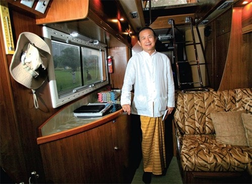 | Ông Vikrom Kromadit trong xe bus trị giá 1,5 triệu USD đi xuyên Á của mình - Ảnh: Quý Hòa |
