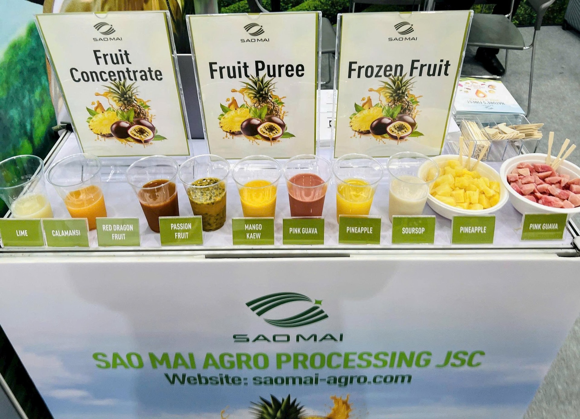 Bên cạnh chanh dây được chế biến đa dạng (nước cốt, xay nhuyễn, đông lạnh), Sao Mai còn giới thiệu các dòng sản phẩm chủ lực khác, thể hiện sự phong phú của nông sản Việt. Nổi bật là nước cốt trái cây đậm đà từ chanh, thanh long đỏ; các loại puree xoài, ổi hồng, dứa đáp ứng khẩu vị quốc tế; và trái cây đông lạnh cao cấp giữ trọn hương vị tươi ngon.