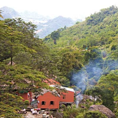 Sau chặng đường bách bộ mệt mỏi, du khách có thể lên cổng trời Thiên Sơn để tới khu vườn Thượng Uyển, nơi có không khí mát mẻ như Đà Lạt. Ngồi trên lầu vọng cao chót vót, du khách thả sức ngắm nhìn phong cảnh núi rừng, thác nước phía chân núi để cảm nhận về hai thế giới vừa chinh phục: nửa mộng mơ, thanh bình, nửa hùng vĩ, dữ dội.