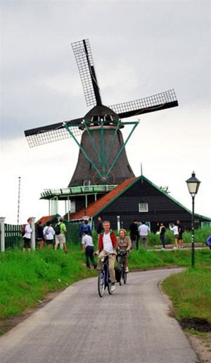 | Sung sướng nhất là có một chiếc xe đạp để vi vu qua con đường nhỏ, một bên là cối xay gió và sông Zaan, một bên là cánh đồng cỏ ngút ngàn - Ảnh: Trung Uyên |
