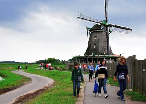 Từ trạm xe buýt, đi bộ khoảng 3 phút là có thể nhìn thấy những cối xay gió có từ thế kỷ 17 vươn mình trên nền trời, soi bóng trên dòng sông Zaan.