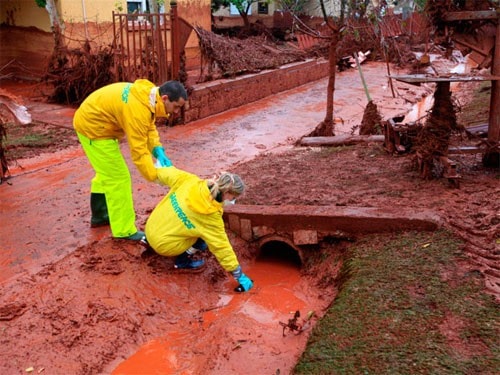 | Lấy mẫu bùn đỏ gần thị trấn Ajkai. Ảnh: Reuters |