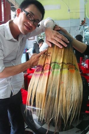 | Mai Hoàng Nhân bên một mái tóc cầu Trường Tiền đã thành hình trên tóc người mẫu |