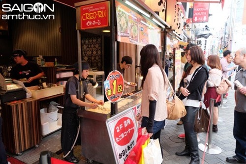 | Một quầy đổ bánh khọt Takoyaki ở khu phố sầm uất Dotonbori (Osaka) |