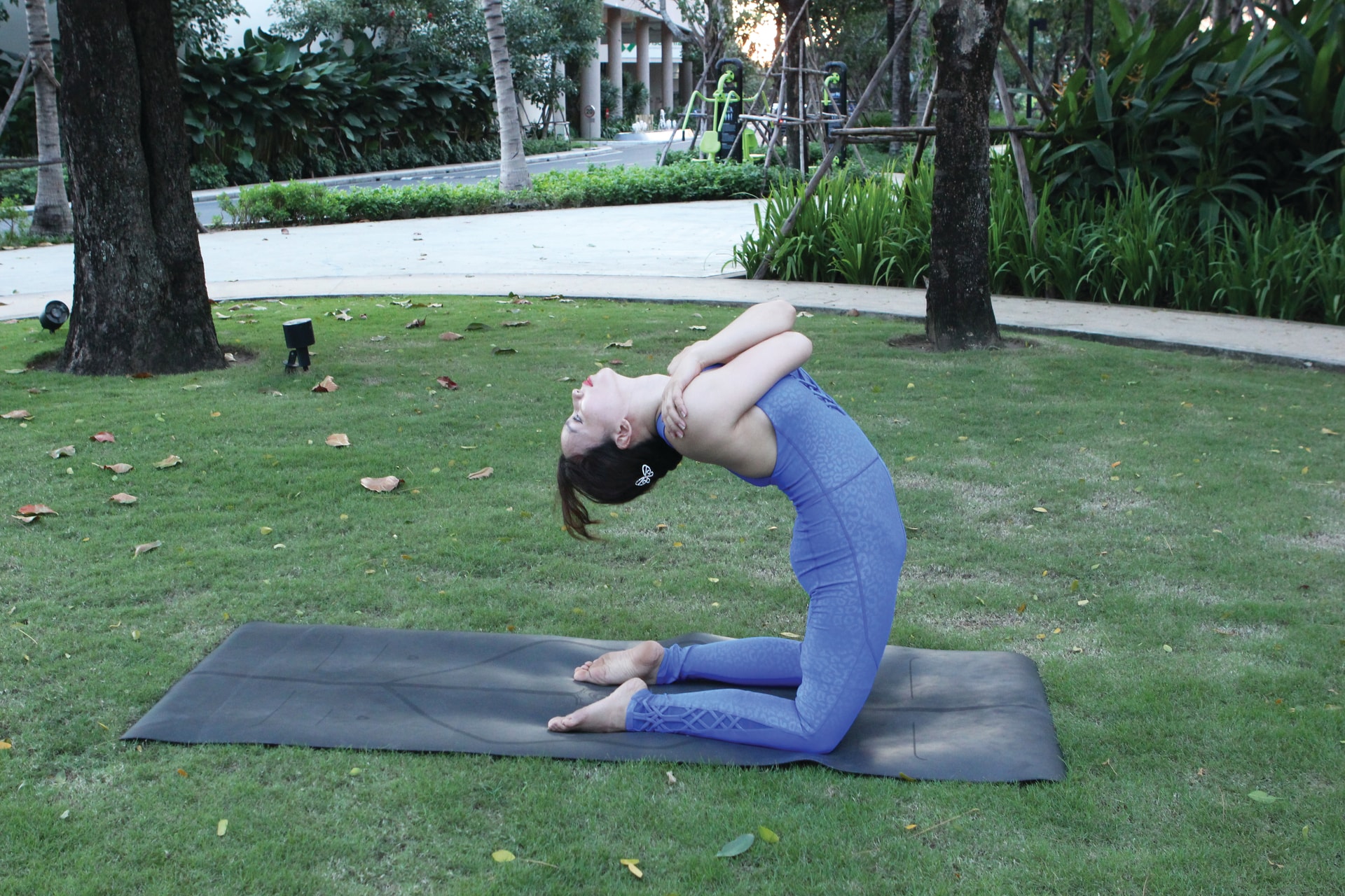 Sửa gù lưng, vẹo cổ, rụt vai. Là hậu quả từ những tư thế sai trong khi ngồi làm việc, cách đi đứng, hoạt động thể chất lặp lại liên tục hằng ngày. Các động tác yoga mở tim, hay ngả sau có hiệu quả trong việc khắc phục tình trạng này.(Ảnh: Tư thế cây cầu) Duy trì cân bằng về giải phẫu. Trong hoạt động thường ngày, cúi người về trước nhiều hơn ngửa ra sau hoặc nghiêng bên, vặn xoắn, kéo giãn cột sống trong khi nhặt đồ, mặc quần áo, làm việc chứ ít khi ngửa người về sau hoặc nghiêng một bên. Các động tác mở tim và ngả sau chính là để điều chỉnh thói quen này, tạo ra sự cân bằng về mặt giải phẫu học, hay sâu xa hơn là về âm dương cho cơ thể. (Ảnh: Tư thế cánh cung) (Ảnh: Tư thế lạc đà biến thể) (Ảnh: Tư thế mèo bò biến thể) (Ảnh: Tư thế bánh xe biến thể vặn xoắn) (Ảnh: Tư thế bồ câu biến thể)